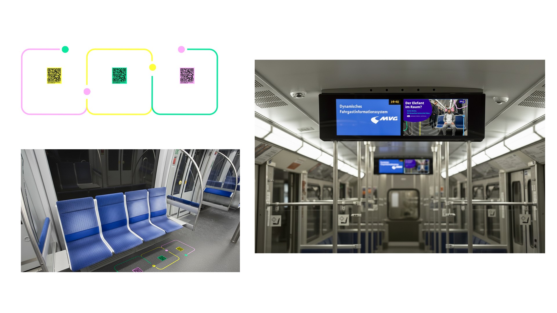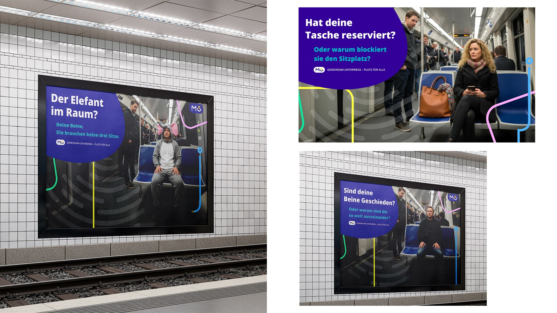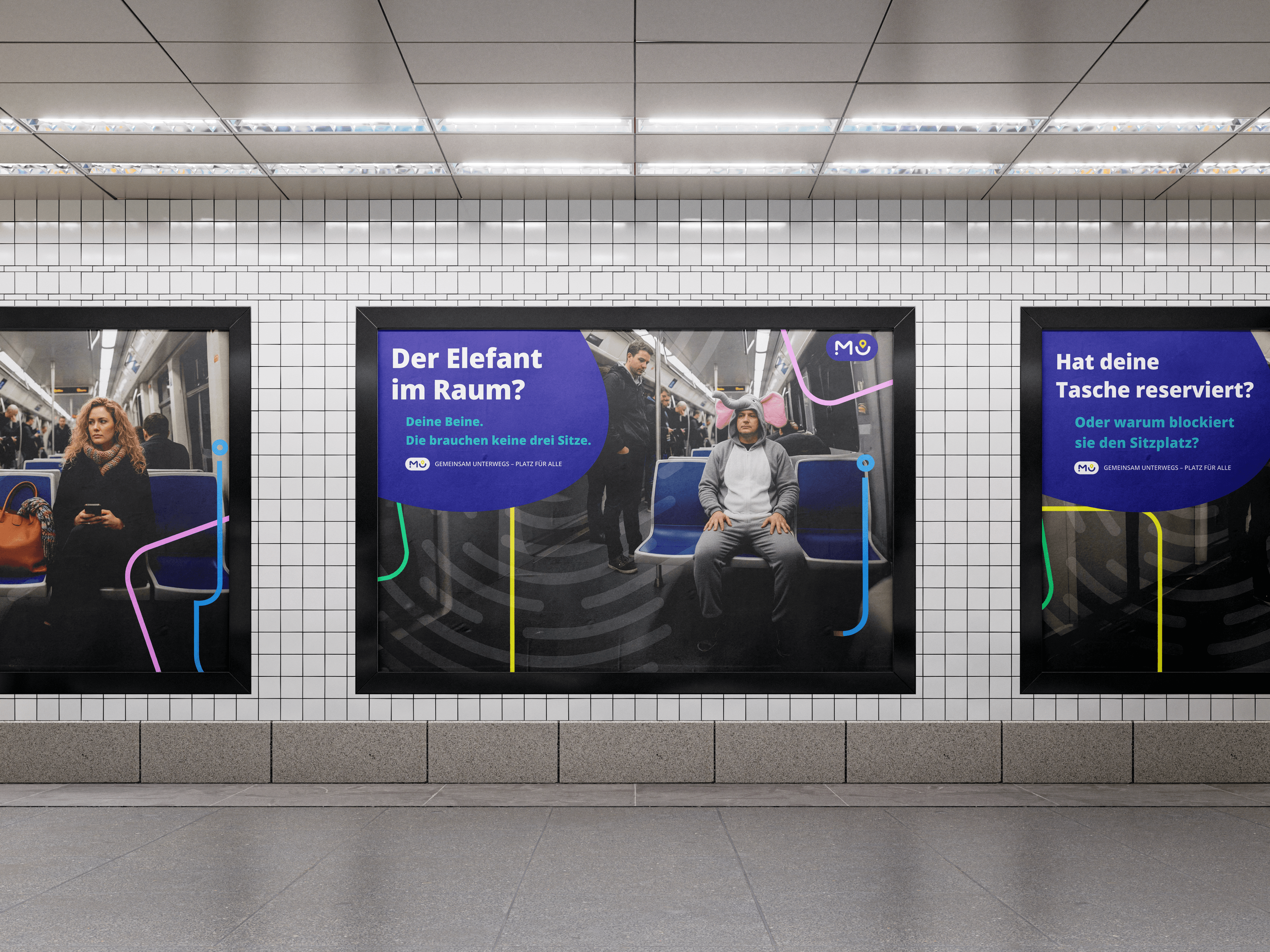 München unterwegs | Anti-Manspreading AR Campaign (Spec) A collaborative awareness campaign tackling "manspreading" on public transit. We designed spatial floor decals for the subway to mark individual seating zones, paired with punchy, pun-driven posters (e.g., "The elephant in the room" or "Your legs don't need three seats"). The physical print elements connect via QR code to a custom AR web app. Gamifying polite behavior, the app scans the user's foot placement—if they stay within their designated box, they are rewarded with an AR animation of dancing Münchner Kindl (Munich’s iconic mascots).